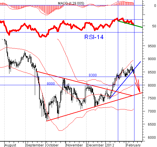 Опережающие индикаторы: индекс волатильности VIX, индекс Baltic Dry, цены на медь показывают, что рост рынка на этой неделе носитхарактер. На дневном графике цены на медь пробили вниз агрессивный повышательный тренд с 09.01.2011, на индикаторе RSI-14 есть медвежьи дивергенции. Если техническая поддержка 8300 будет пробита вниз, то можно будет открыть короткие позиции с целью снижения 8000, где проходит средняя линия конверта Бол.. Держи и дрожи!