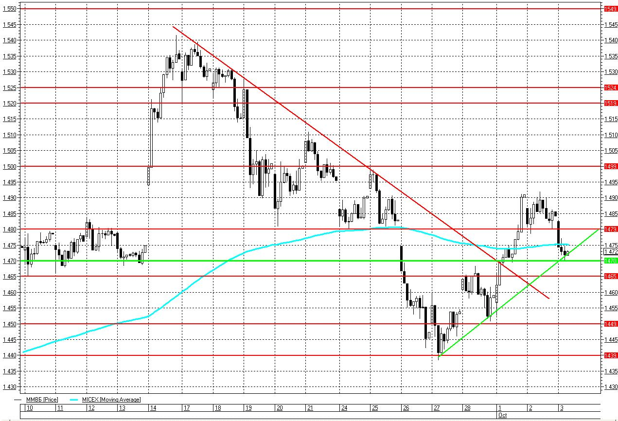 Индекс ММВБ торгуется в минусе около одного процента, на фоне ожиданий плохих отчетностей компаний. Лучше рынка чувствуется себя финансовый сектор, хуже металлургический. В 13:00 вышли данные по розничным продажам в Еврозоне, которые оказались лучше ожиданий. Европейские рынки проигнорировали хорошие данные и остались на прежнем уровне. Сегодня на рынке ждут комплексных данных по ипотеке в США. Картина на рынке складывается негативная, скорее всего снижение связанно с большими продажами крупных игроков. Ближайшая цель снижения уровень 1450 пунктов ММВБ, снижение продолжится, в случае если рынок сможет преодолеть уровень 1470, как хорошую поддержку.