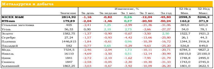 Индекс сырьевого сектора ММВБ MICEX М&М опустился на 1,16%, на РТС RTSmm потерял 2,04%.