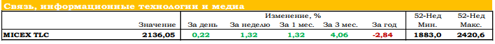 Индекс компаний телекоммуникационного сектора MICEX TLC вырос на 0,22%.