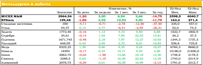 Индекс сырьевого сектора ММВБ MICEX М&М снизился на 1,20%, на РТС RTSmm потерял 1,50%.
