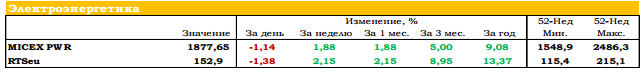 Индекс компаний электроэнергетики MICEX PWR снизился на 1,14%, на РТС отраслевой индекс RTSeu потерял 1,38%.