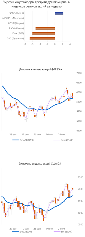 Европейские фондовые индексы на минувшей неделе понесли значительные потери из-за выросшей неопределенности относительно разрешения греческого долгового кризиса после заявления в прошлый понедельник премьер-министра Греции Папандреу о необходимости проведения референдума по вопросу принятия согласованного с Евросоюзом пакета помощи. Лидеры Евросоюза потребовали от Папандреу объяснений, пригрозив ему тем, что МВФ не выдаст Греции очередной валютный транш в том случае, если страна будет затягивать принятие мер, направленных на ее собственное спасение. Выросшую вероятность выхода Греции из еврозоны подтвердили в своих заявлениях глава Еврокомиссии Ж. М. Баррозу, глава Еврогруппы Ж.-К. Юнкер и лидеры некоторых европейских стран. В минувшие выходные власти Греции договорились о создании нового коалиционного правительства, а нынешний премьер-министр Греции Й.Папандреу сообщил о своем намерении уйти в отставку после того, как новое правительство будет сформировано. В начале этой недели складывающуюся в Греции ситуацию обсудит Еврогруппа.