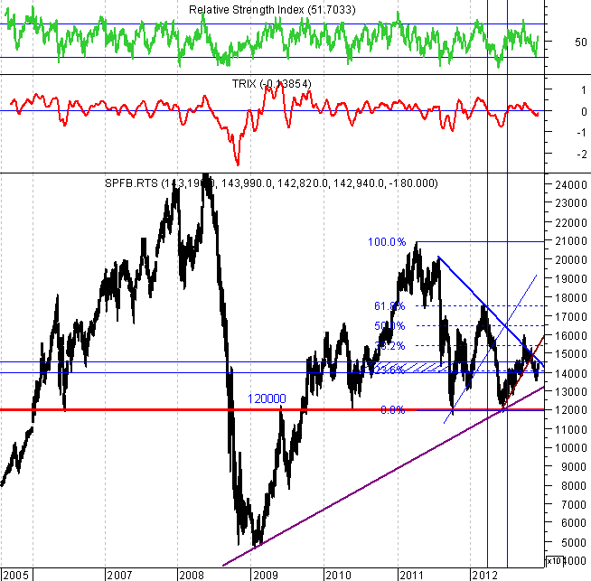 Сегодня рынок показывает нейтральную динамику. Начало дня было оптимистичным, но постепенно котировки сползли вниз на уровни вчерашнего закрытия. Можно конечно купить акции, но надо иметь в виду, что ситуация на денежном рынке постепенно ухудшается – доходность рублевых кредитов «овернайт» сегодня на уровне 6,5%. Курс валютной пары Eur/Usd «топчется» у отметки 1,3, на фондовом рынке Китая не все благополучно. Кто хочет рисковать – покупает, но например, в диапазоне 144000 — 145000 на графике фьючерса индекса РТС находится сильная зона сопротивления – многомесячный понижательный тренд. Фьючерс или пробьет этот тренд и выстрелит на или 3% наверх или не пробьет… Момент истины!