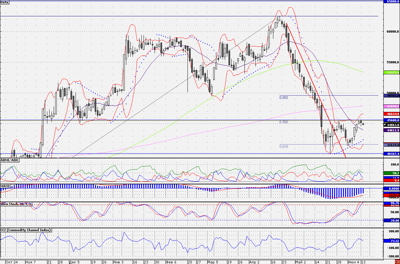 Привилегированные акции «Транснефти» накануне не смогли преодолеть уровень сопротивления 45600 руб., где располагается уровень 50% коррекции по Фибоначчи проведенной между минимумом октября прошлого года и максимумом апреля текущего года. Наш торговый робот открыл короткие позиции по бумагам от отметки 45542 руб. и пока удерживает их. Индикатор ADMI/ADX показывает ослабление напора «быков» (линия «быков» направилась навстречу линии «медведей»), при этом осциллятор медленный Stochastic (10;3;3) находится в зоне перекупленности. Исходя из показаний индикаторов, высока вероятность продолжения нисходящего движения, для которого ближайшей целью может выступить 21-дневная скользящая средняя (сегодня на уровне 44011 руб.).