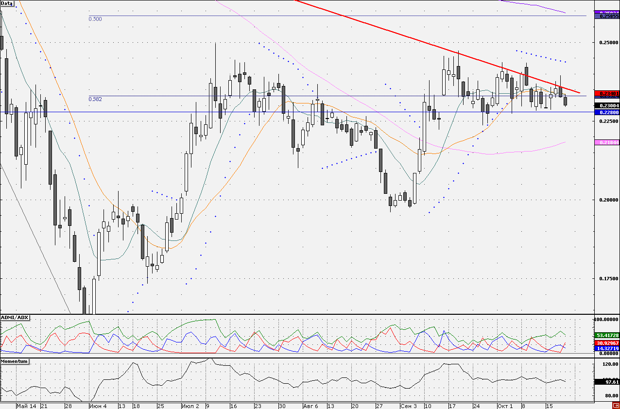 Акции «ФСК ЕЭС» с начала октября консолидируются под линией нисходящего тренда, действующего с января прошлого года. Сегодня данный уровень сопротивления находится на отметке 23,50 коп., кроме того, чуть ниже проходят 10- и 21- дневные скользящие средние. Пока технические индикаторы посылают преимущественно негативные сигналы. Индикатор ADMI/ADX показывает, что силы «медведей» по бумагам преобладают (линия «быков» находится ниже линии «медведей»). График осциллятора Momentum направлен вниз, что может свидетельствовать о продолжении нисходящей динамики акций. Ближайшей поддержкой является уровень 22,80 коп. Стоит отметить, что бумаги уже не раз удерживали данную отметку, в связи с чем от поддержки 22,80 коп. спекулятивные «короткие» позиции стоит сокращать. Наш 30-минутный торговый робот пока находится в «шортах», удерживая короткие позиции от отметки 23,50 коп.