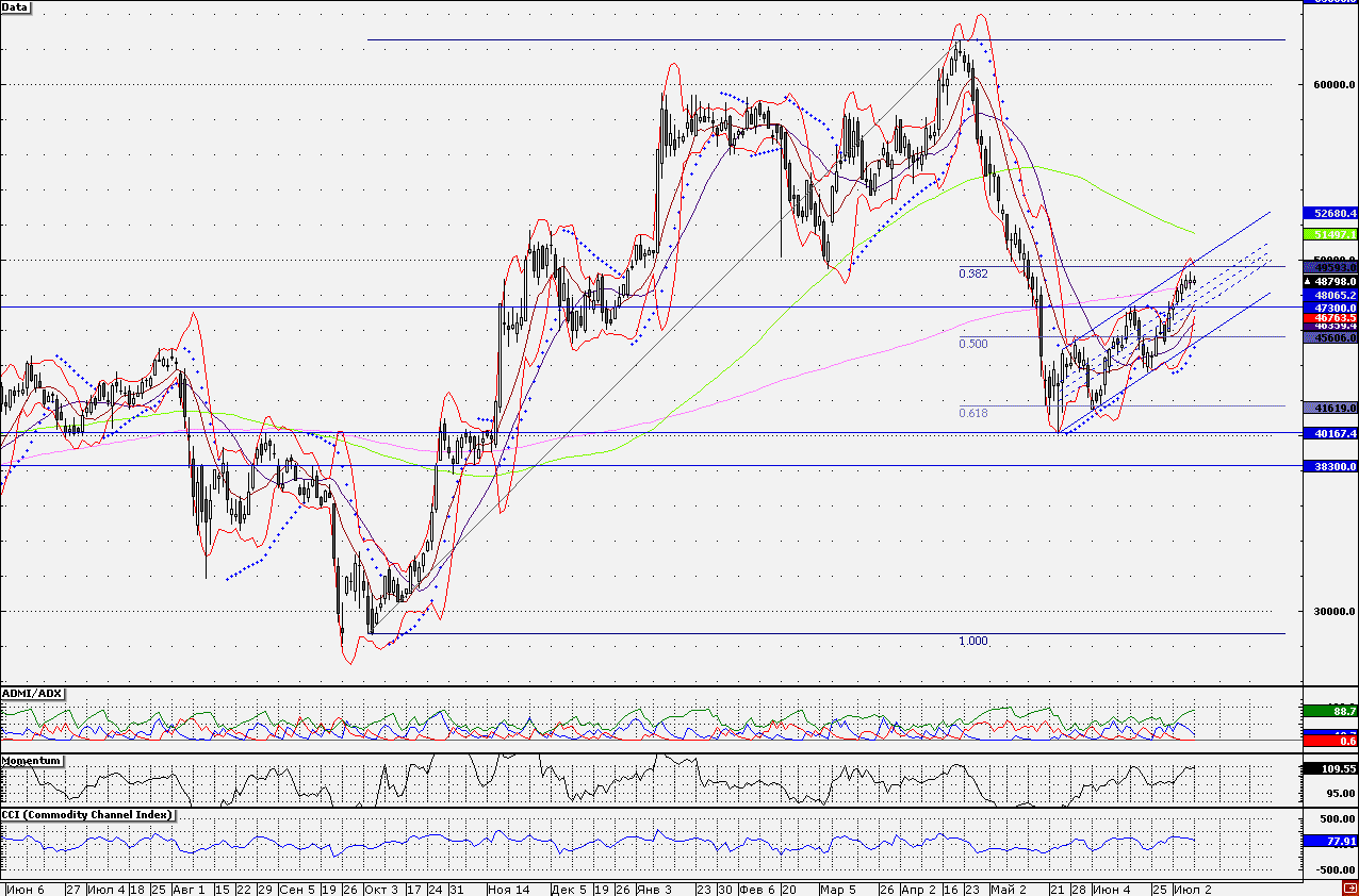 Привилегированные акции «Транснефти» сегодня тестируют на прочность 200-дневную скользящую среднюю (сегодня 48700 руб.). В случае если данная отметка не устоит, то ближайшим уровнем поддержки по бумагам станет 47500 руб., чуть ниже которой проходит 10-дневная скользящая средняя. Однако, если данный уровень удастся удержать, то ближайшим сопротивлением выступит круглая отметка 50000 руб. Рекомендую все же зафиксировать прибыль по открытым длинным позициям, поскольку о вероятности развития нисходящего движения акций позволяют говорить показания индикаторов. Так график индикатора Momentum направлен вниз, что может свидетельствовать о развитии нисходящего сценария. Также в пользу негативного движения акций свидетельствует сужение канала индикатора Bollinger Bands.