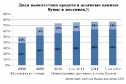 Депозиты являются основным источником фондирования банка. По итогам 1К12 доля депозитов в структуре фондирования кредитной организации не изменилась относительно 2011 года и составляла 63%. Объем депозитов за период 1К12 вырос на 2,4% и превысил 150 млрд рублей. Тогда как в среднем по банковской системе за первые 3 месяца текущего года наблюдался отток депозитов, что привело к снижению последних на 2,4%.