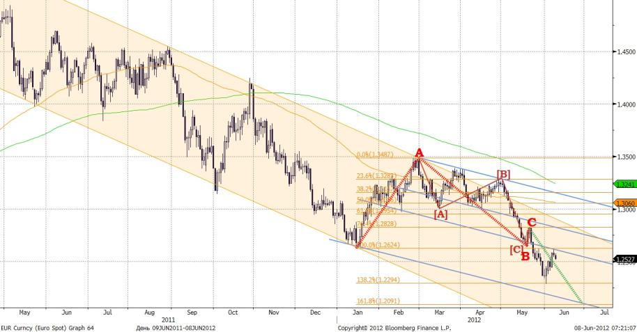 Неожиданным было вчерашнее решение Народного банка Китая сократить с сегодняшнего дня (8 июня) ставки по депозитам и по годовым кредитам. Ставки снижены на 0,25%, теперь они будут составлять 6,31% и 3,25% соответственно. Рынок отреагировал на решение китайского ЦБ бодрым ростом. Валютная пара евро/доллар к вечеру достигла отметки 1,2625. Однако дальнейшие новости только разочаровывали участников торгов. Рейтинговое агентство Fitch вновь напомнило игрокам о европейском долговом кризисе, об Испании и о высоком уровне рыночных рисков снизив рейтинг государственного долга Испании сразу аж на 3 ступени до «ВВВ» и присвоило ему негативный прогноз. Другим разочарованием для рынков стало выступление главы ФРС Бена Бернанке перед Конгрессом, на котором Бернанке вновь сказал что Федеральная резервная система следит за экономической ситуацией и готова предпринять шаги по защите экономики в случае необходимости, т.е. ББ вновь подтвердил то, что ФРС продолжает занимать в настоящее время пассивную позицию.