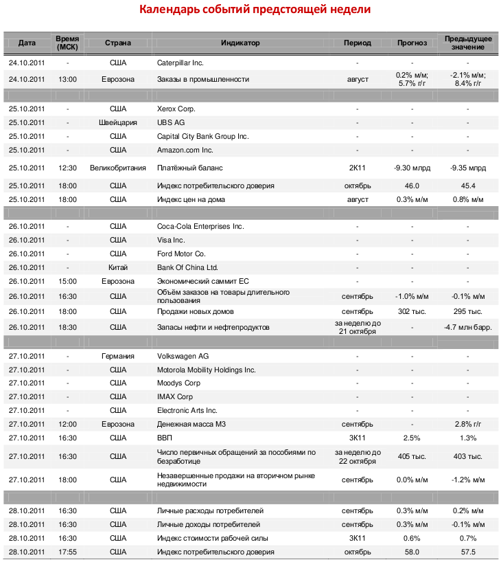 Полагаем, что неопределенность в действиях игроков будет тнаблюдаться вплоть до проведения саммита ЕС, который состоится в среду. В случае, если участники Евросоюза примут окончательное решение по выделению денежных средств Греции и решат ряд важных вопросов для преодоления кризиса стран Еврозоны, то отечественные площадки могут продемонстрировать восходящее движение. При этом индекс ММВБ закрепится выше уровня в 1450 пунктов. Однако считаем, что новости будут носить краткосрочный характер. А поскольку инвесторы в последнее время предпочитают спекулятивные идеи долгосрочным покупкам, то коррекция на отечественных площадках не исключена. На этой неделе ожидаем следующей макростатистики: индекс цен на дома, индекс потребительского доверия, объем заказов на товары длительного пользования, продажи новых домов, ВВП, личные доходы и расходы потребителей, индекс потребительского доверия, а также запасы нефти и нефтепродуктов и количество первичных обращений за пособиями по безработице. Свои финансовые результаты обнародуют такие компании как Caterpillar Inc., Xerox Corp., UBS AG, Coca-Cola Enterprises Inc., Visa Inc., Ford Motor Co., Bank Of China Ltd., Volkswagen AG, Moody’s Corp, IMAX Corp. и другие.