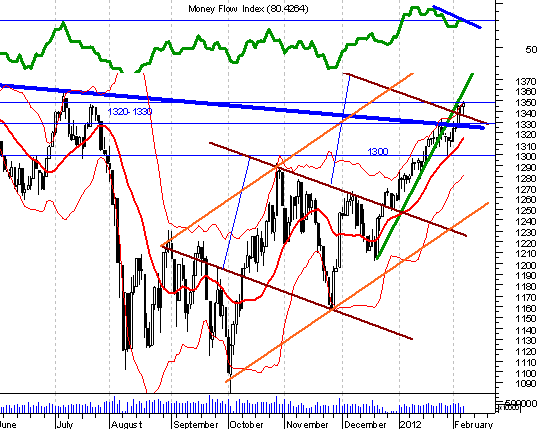 Индекс ММВБ имеет сопротивление на уровне 1600 и 1620 пунктов, американский индекс S&P-500 уже подошел к своему сопротивлению. Определяющей для индекса S&P-500 является зона поддержки 1320- 1330, где было закрытокоротких позиций. Если индекс снизится ниже 1320 пунктов это будет первый звоночек о неблагополучии и возможном углублении коррекции в район 1297. Из американских акций выделим JP Morgan Chase & Co. Common St (JPM). С апреля прошлого года до октября котировки снижались, затем росли до февраля с.г. и в данный момент рост затормозился на уровне 50% коррекции к предыдущему снижению. Если будет пробит внизна уровне 37,5, рекомендую открыть короткие позиции с целью 35,5 (минимальная цель). На индикаторе MFI есть медвежье расхождение, цена находится у верхнего конверта Бол. — профессионалы в такой ситуации не покупают.