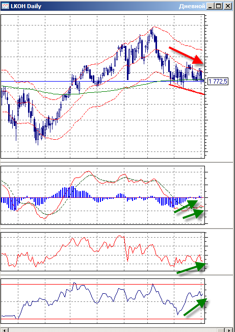Сегодня при открытии рынок рос, но сейчас снижается. В настоящий момент для контртрендовых моментов на акциях (об.) находятся на уровне 91,14, 1751,3 и ГМК <>Норильского Никеля> на уровне 5035. Поскольку котировки снижаются быстро на графике об. может образоваться бычье расхождение по индикаторам MACD и MFI , на графике может образовываться полный комплект дивергенций, включая RSI. На графике также могут образоваться бычьи дивергенции, но поскольку это бумага перестала быть и стала> сильно диапазонной> возможно стоит воздержаться от покупок.
