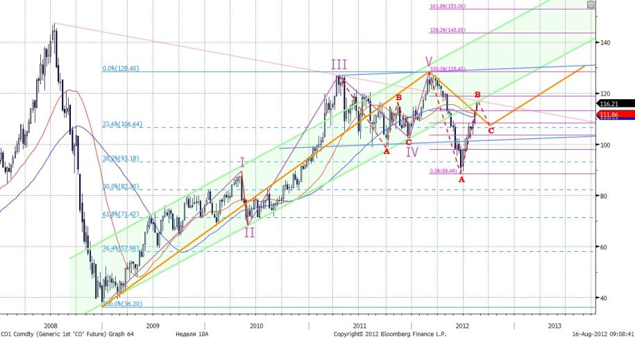 В долгосрочной перспективе формируется плоская коррекция, как следует из графика 3. Минимальная точка коррекции уже достигнута. Ждем роста котировок Brent к отметке $115.