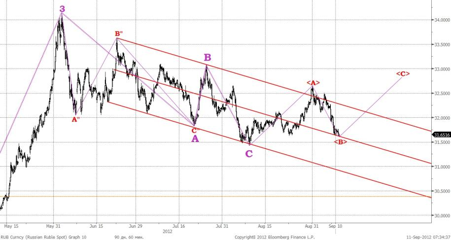 Пара доллар/рубль снизилась 10 сентября в рамках волны до отметки 31,6080, см график 7. Полагаем, в ближайшее время начнет формироваться волна Целью волны является отметка 32.80. Сегодня ожидаем ослабления российской валюты до уровня 31,80 – 31,85 рубля за $1. Предполагаемая структура динамики соотношения доллара США и российской валюты в среднесрочной перспективе изображена на графиках 7 и 8.