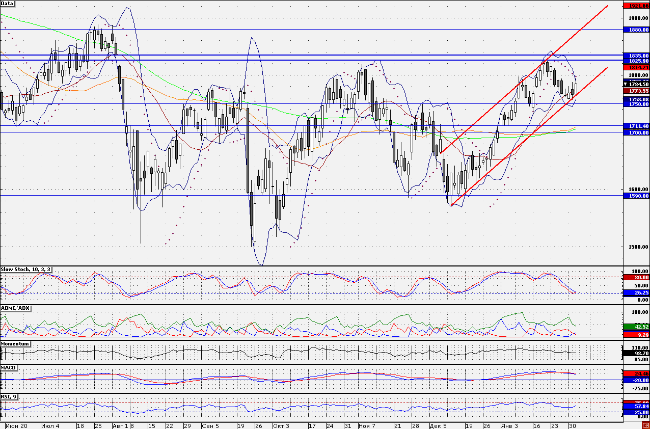 Акции «ЛУКОЙЛа» с середины декабря 2011 года движутся в восходящем канале. Несколько последних сессий акции тестируют на прочность нижнюю границу канала, усиленную близостью 21-дневной скользящей средней. В связи с тем, что акции пока удерживают нижнюю границу канала вероятность того, что они продолжат свое движение в указанном канале, высока. В этом случае с технической точки зрения целью выступит достижение верхней границы канала (сегодня — отметка 1880,00 руб.). В пользу развития данного сценария свидетельствует индикатор ADMI/ADX, который показывает, что напор «медведей» значительно ослаб. Сужение канала Bollinger Bands и пересечение акций с индикатором Parabolic Sar также подтверждают возможность роста акций в ближайшее время.