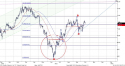 В настоящий момент формируется волна роста «В» в рамках «плоской коррекции» А-В-С. Коррекции предшествовала без малого трехлетняя фаза роста. Вполне логично, что период компенсации роста предположительно будет длиться порядка полутора лет и, по нашим расчетам, завершится в первом квартале 2013 года, после чего начнет формироваться следующая волна подъема котировок. Текущая волна «В» в рамках коррекционного движения направлена вверх, целью, по нашим прикидкам, служит отметка $1880. После чего может последовать волна «С» – цель $1780; на этом «плоская коррекция», по нашему мнению, будет реализована, далее стартует фаза роста.
