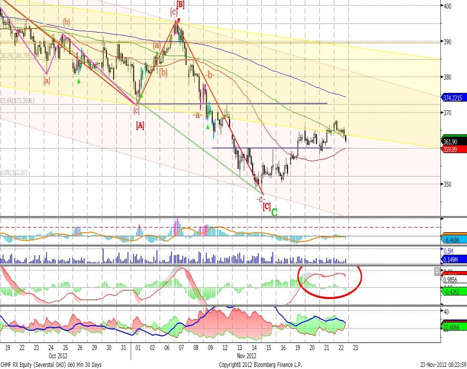 Акции Северстали, структура нисходящего движения выглядит сформированной, однако акции компании продолжают находиться в пределах среднесрочного нисходящего канала. MACD сигнализирует о начале локального снижения, однако уровень 360 рублей будет выступать в качестве сильной поддержки. ADX говорит о том, что локальный рост сошел на нет, DMI+ практически пересекся с DMI-, ADX направился вниз, нейтрально. Поддержка 360 рублей за акцию, сопротивление – 372,50. Рекомендация: Вне рынка.