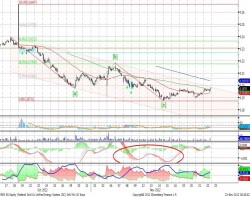 Индекс ММВБ на дневном интервале – нисходящий тренд затухает, однако индекс продолжает оставаться в рамках нисходящего канала. Коррекционный зигзаг A”-B”-C”, направленный вниз выглядит завершенным. Поддержка – 1395 пунктов. Сопротивление – 1420; 1450. MACD формирует на дневных интервалах сигнал к росту. ADX говорит о том, что нисходящий тренд медленно затухает, DMI- и DMI+ постепенно сходятся, но индикатор нисходящего тренда остается пока выше индикатора роста, ADX находится в верхней части шкалы и начал разворот вниз, что говорит о замедлении падения и возможном скором прекращении нисходящего тренда. Индекс ММВБ – часовой интервал. Индекс движется к верхней границе нисходящего канала, но пока остается в его пределах. MACD сформировал сигнал к снижению. DMI- находится выше DMI+ и индикаторы начали расходиться, ADX находиться внизу шкалы, что говорит о том, что локальное снижение не набрало силу. Рекомендация: Вне рынка.