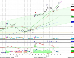 Акции Сбербанка сформировали локальный импульс вверх, завершив формирование среднесрочной фазы роста. MACD – слабый сигнал вверх. ADX указывает на отсутствие тренда. Индикатор, основанный на динамике ADX, 8 января дал сигнал к продаже. Структура локального импульса направленного вверх выглядит сформированной, возможно коррекционное снижение. Поддержка на уровне 100,00; 98,00; 96,00; 94,00 и 92,00 рубля. Сопротивление –101,27. Рекомендация: Вне рынка.
