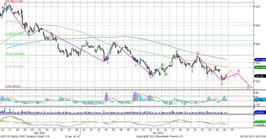 Ранее мы предполагали, сто акции Газпрома могут просесть вплоть до уровня 140 рублей. Однако, в связи с высоким уровнем роста экономики США в третьем квартале, мы пересмотрели глубину проседания стоимости акций компании до 148,20 рубля за акцию. Сегодня ждем роста стоимости акций Газпрома к отметке 153 рубля, после чего в рамках волны 5 снижение возобновиться.