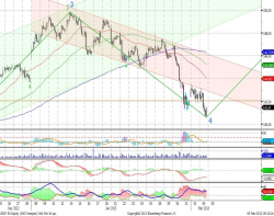 Индекс ММВБ двинулся вниз от верхней границы восходящего тренда. MACD сформировал сигнал вниз. ADX указывает на замедление долгосрочного восходящего движения, DMI+ находится выше DMI-, но постепенно сходятся, ADX в верхней части шкалы и направлен вниз. Индикатор, основанный на динамике ADX, дал тройной сигнал на продажу. Структура роста (середина ноября 2012 года – январь 2013 года) выглядит завершенной, в связи с чем, в ближайшее время ожидаем коррекционное снижение в рамках восходящего тренда.