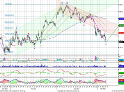 Индекс ММВБ двинулся вниз от верхней границы восходящего тренда. MACD сформировал сигнал вниз. ADX указывает на замедление долгосрочного восходящего движения, DMI+ находится выше DMI-, но постепенно сходятся, ADX в верхней части шкалы и направлен вниз. Индикатор, основанный на динамике ADX, дал тройной сигнал на продажу.