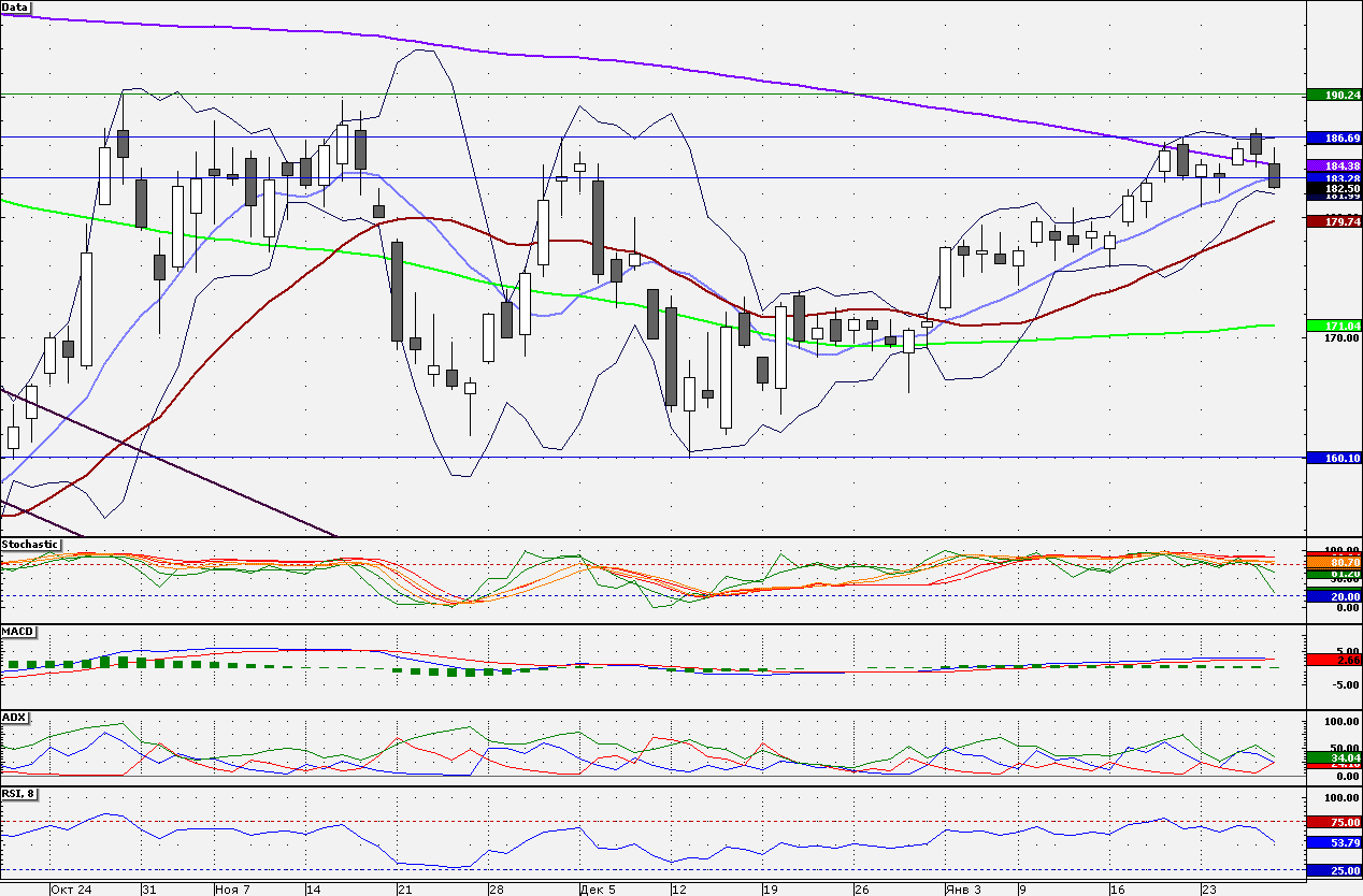 Акции компании в пятницу закрылись ниже 10-дневной скользящей средней, что располагает к продолжению распродаж с целью достижения 180 руб. Сопротивлением является отметка 183,33 руб.