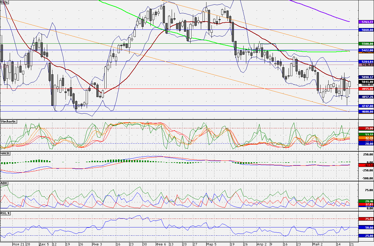 Акции ГМК «Норникель» закрылись на 21-дневной скользящей средней. Бумаги компании удержались выше 5000 руб. От психологической отметки «лонги» можно наращивать, поскольку 24 мая состоится закрытия реестра. Поддержкой является 4850 руб.