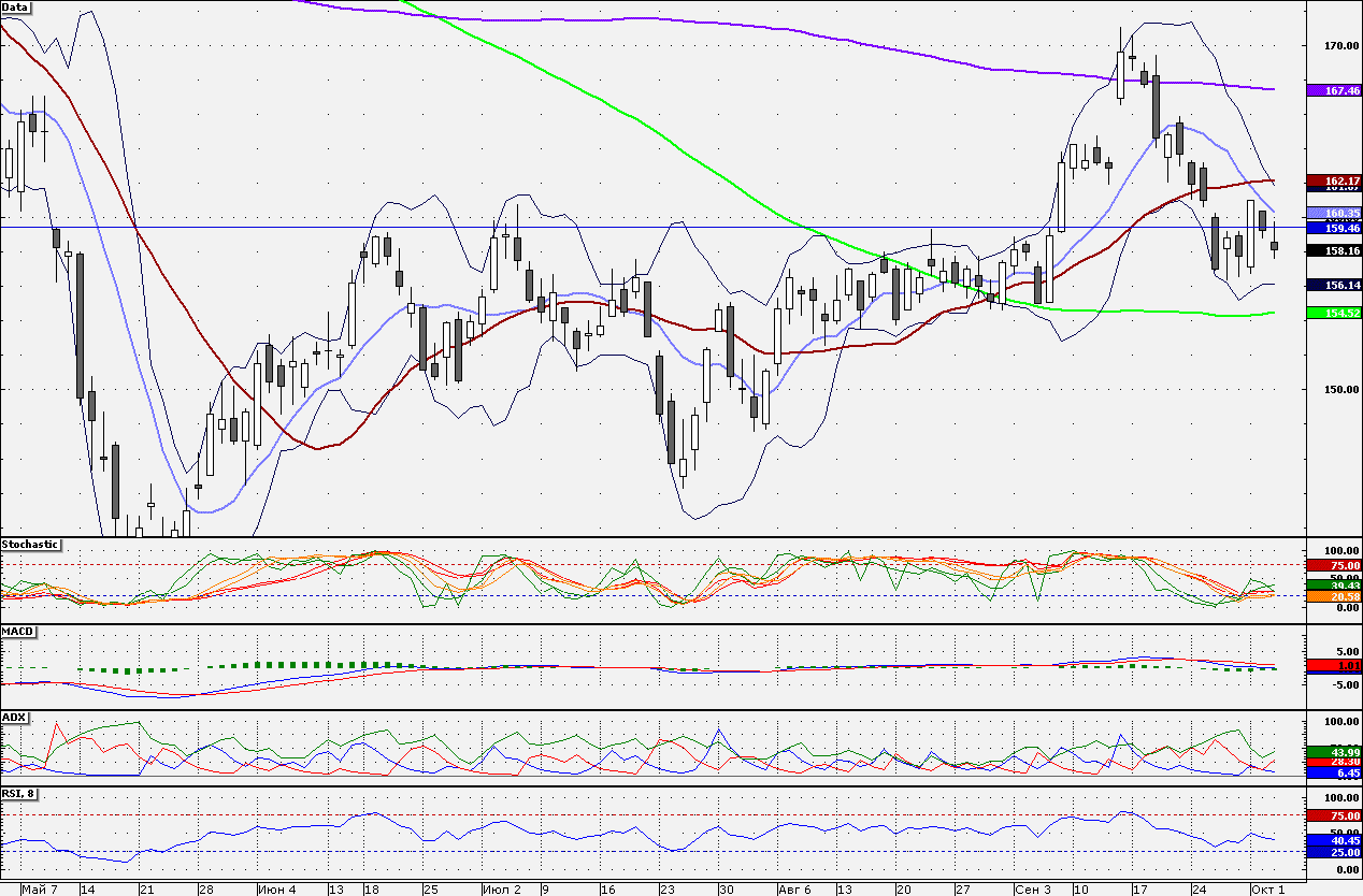 Акции «Газпрома» вчера вновь протестировали 160 руб., но данная отметка в очередной раз не поддалась «быкам» и акции продолжили консолидироваться ниже данной отметки. Сегодня акции могут вновь протестировать круглую отметку, немного выше которой располагается 10-дневная скользящая средняя. Далее сопротивлением станет район 162,00 руб., где проходит 21-дневная скользящая средняя. Поддержкой является отметка 157 руб.