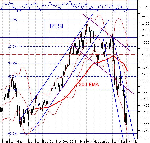 Если взглянуть на график индекса РТС с технических позиций, то видно, что рост индекса еще не завершен. В октябре попытка игроков на понижение пробить предыдущий минимум 1224,73 (25.05.10) на индексе РТС не удалась, и получился «суп из черепах» от Линды Рашке, который подтвердился объемом торгов. На недельных график многих акций на прошлой неделе образовалась разворотная фигура «молот», на этой неделе также рисуется разворотная фигура. Все дело в объемах торгов. Если объемы торгов акциями на этой неделе будут выше средних по рынку, то мы наблюдаем формирование бычьего рынка. Если ниже, это коррекционный отскок к падению. Пока индекс РТС не вырастет до верхней границы агрессивного понижающегося тренда — 1410 (с 02.08.11) реальную силу «быков» замерить сложно.
