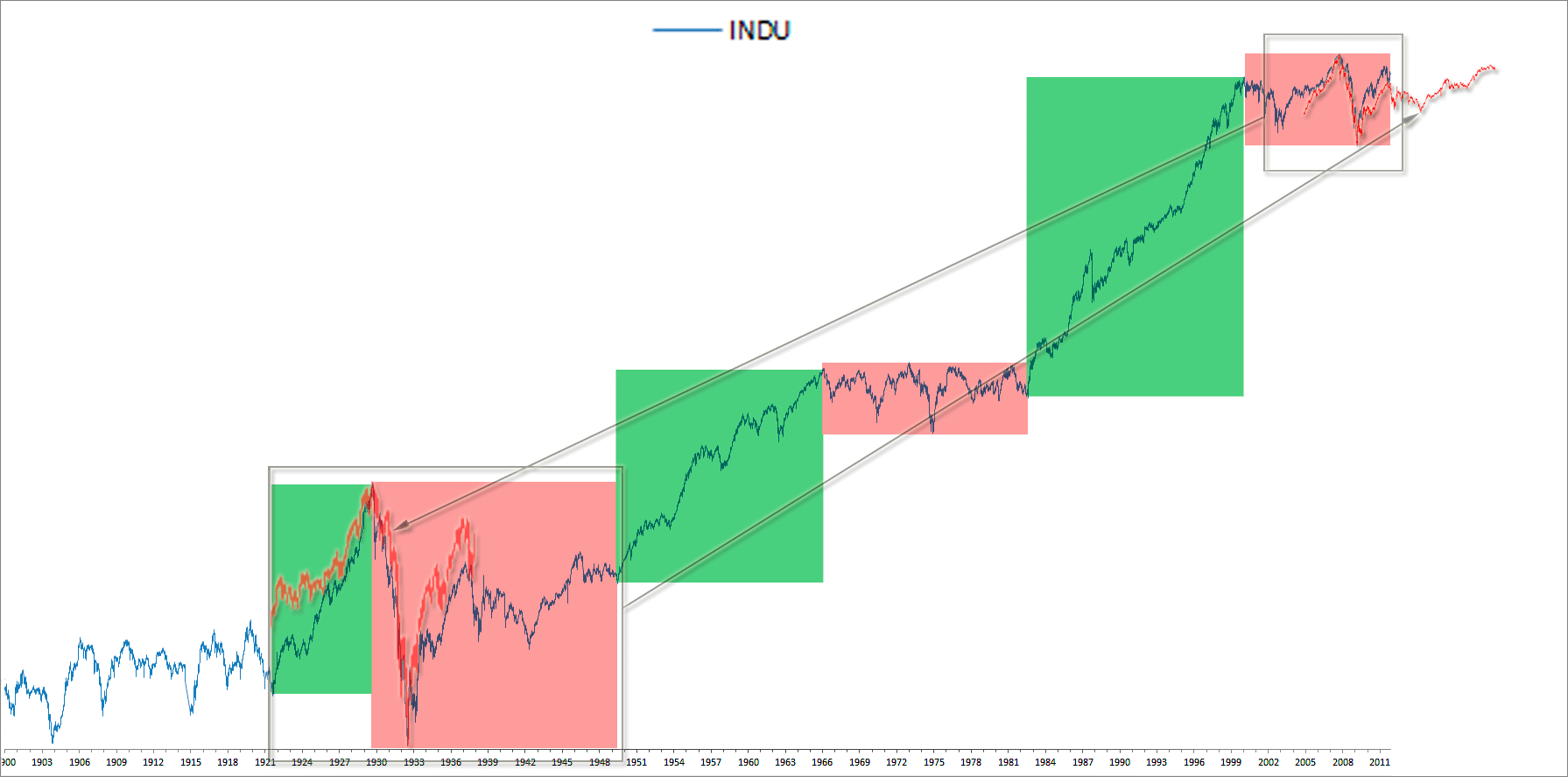 *На графике — индекс DJIA, где на период 1930-х годов (Великая депрессия) наложен период кризиса 2008 года. И наоборот, на настоящее время наложен график времен Великой депрессии.*
