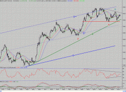 Исследуя 2- часовой график индекса ММВБ, видим, что после непродолжительной утренней консолидации котировки пошли в рост. Однако активность покупателей ввиду предстоящих длинных выходных была невысокой, и после обеда котировки легли в «дрейф». В результате день закрылся в небольшом плюсе (0,29%).