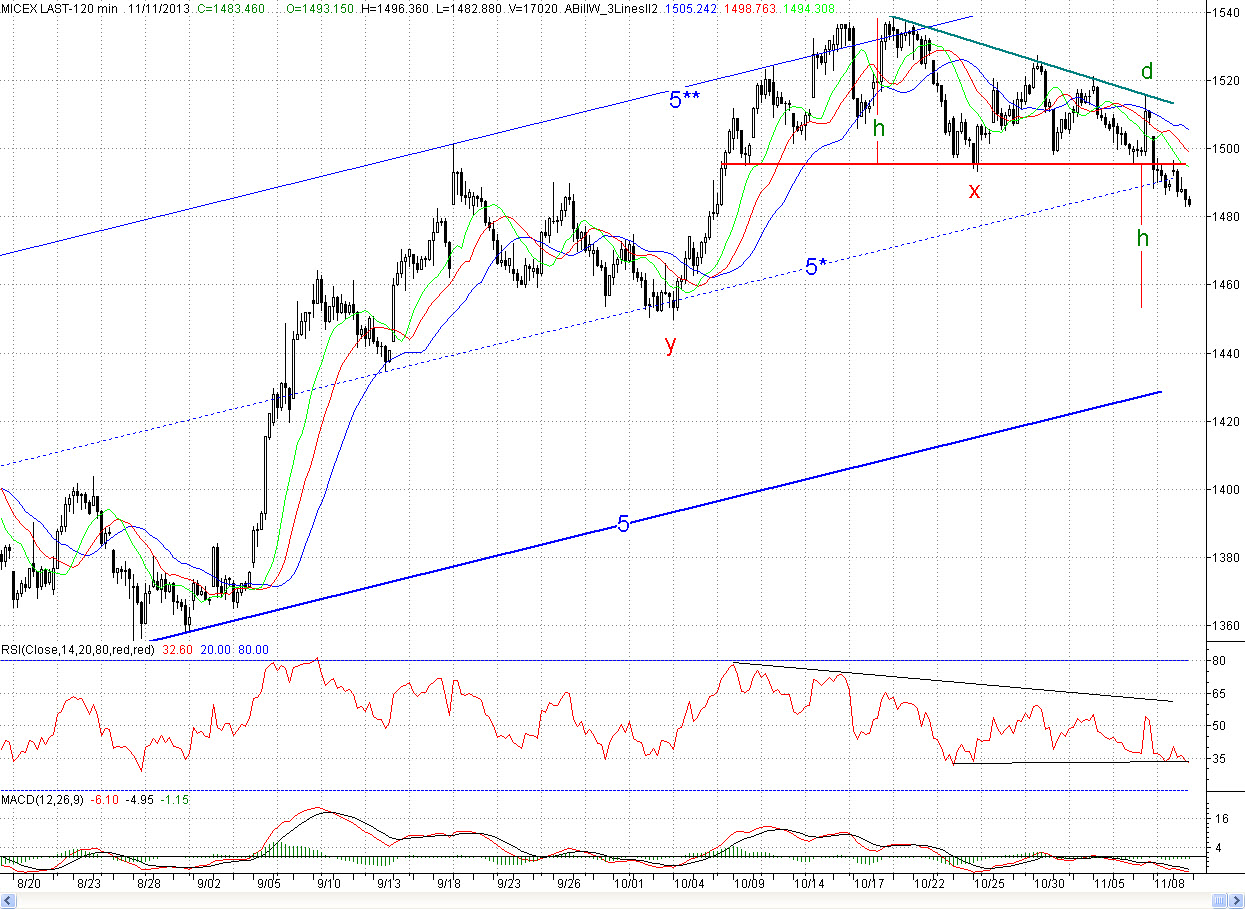 На это указывает и техническая картина, как на 2- часовом, так и на дневном графиках. Особенно она негативна на дневном интервале, который показывает, что снижение по нему только началось, и падать есть куда (нижняя граница среднесрочного растущего канала (5-5**)) Так что быкам надо очень сильно постараться, чтобы переломить ситуацию. Однако, старания этого, судя по вчерашним торгам как раз и нет, что наводит на грустные размышления о дальнейшей судьбе покупателей.