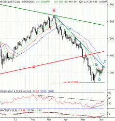На сегодня ближайшим сопротивлением выступит субботний максимум, а далее – уровень 50%-ной коррекции от падения с начала мая. Ближайшей поддержкой – субботнее незакрытое окно (~1333 п.), а далее – тренд (7). Ключевой остаётся район минимума «b» (1278,5 п.).