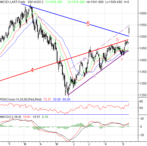 Исследуя 2-часовой график индекса ММВБ, видим, что открывшись с большим гэпом вверх, котировки сразу преодолели не только долгосрочный растущий тренд (4), но и ключевое сопротивление в лице долгосрочного падающего тренда (5). В пятницу мы писали, что покорение именно этого рубежа открывает «быкам» дорогу на годовой максимум. Но не думали, что «пилюля от Бернанке» вызовет столь бурную реакцию, что данный тренд будет пройден даже без последующего тестирования. После этого рост продолжился с небольшими передышками вплоть до самого закрытия. И лишь под самый занавес произошла небольшая коррекция, которая погоды, конечно, не сделала.