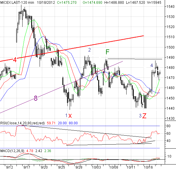 Исследуя 2-часовой график индекса ММВБ, видим, что открывшись практически на тех же уровнях, котировки продолжили восхождение, начатое днём ранее. Интересно, что внешний фон при этом был более чем спокоен, так что рост происходил на внутренних драйверах и, скорее всего, по инерции от позитива среды. В первые минуты ценам удалось преодолеть ближайшее сопротивление в лице верхней грани «треугольника» и добраться до ключевого рубежа медвежьей обороны – дневного фрактала на покупку F (1488,55 п.). Кстати, в данном районе проходит и долгосрочный падающий тренд (7), берущий своё начало с апреля 2011 года (см. дневной график). От этого района «мишки» начали довольно активную контратаку и в итоге скинули цены с верхней грани «треугольника». Однако «быки» отступали стройными рядами и в целом сумели удержаться в районе этой грани, таким образом, закрыв день в «нуле».