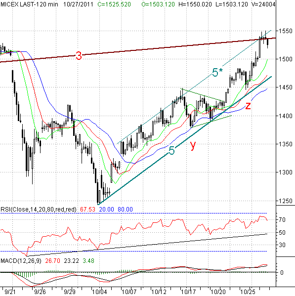 Сегодня заключительный день торговой недели, и пока она закрывается хорошо для покупателей. В прошлую пятницу мы писали, что если в этот день «быки» сумеют удержать текущие уровни, то у них сохранятся хорошие шансы возобновить рост на следующей неделе. А в понедельник 24.10 мы уточнили, что «если недельная свеча в форме повешенного не подтвердится, то мы увидим ещё как минимум одну длинную белую свечу». Так и произошло – «быки» получили ещё одну неделю банкета. При этом они достигли района важных сопротивлений, так что теперь им, по всей видимости, придётся поумерить свой пыл. Да и, как говорится, «банкет банкетом, а печень надо беречь» ☺. В принципе, пока ситуация по рынку достаточно хороша, так что покупатели могут себе позволить и коррекцию вплоть до уровня 1500 п. – что учитывая утренний позитивный фон пока представляется не столь вероятным (хотя часть игроков конечно будет фиксировать прибыль).