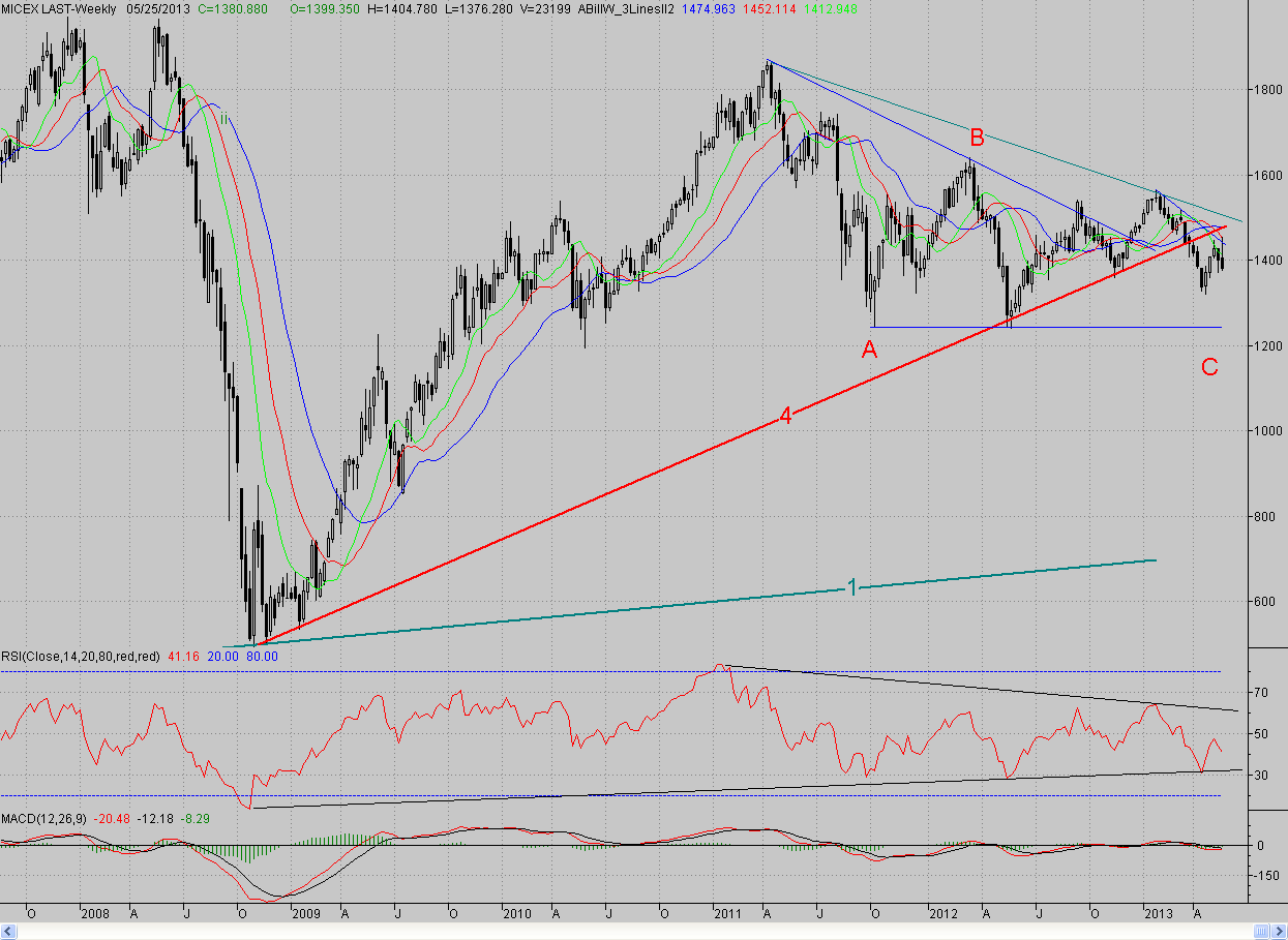 Соответственно, он наряду с линией (9*) и уровнем 62%-ной коррекции от всего отскока с 22 апреля будет основной поддержкой. И «быкам» необходимо во что бы то ни стало удержать данный редут, в противном случае «медведи» постараются возобновить среднесрочное падение с февраля этого года. И тогда мы можем увидеть не только тестирование годового минимума, но и снижение до района минимумов предыдущих трёх лет (1240-1250 пп.). Так что «быкам» есть за что биться. Ближайшей же поддержкой станет пятничный минимум (1376,3 п.).