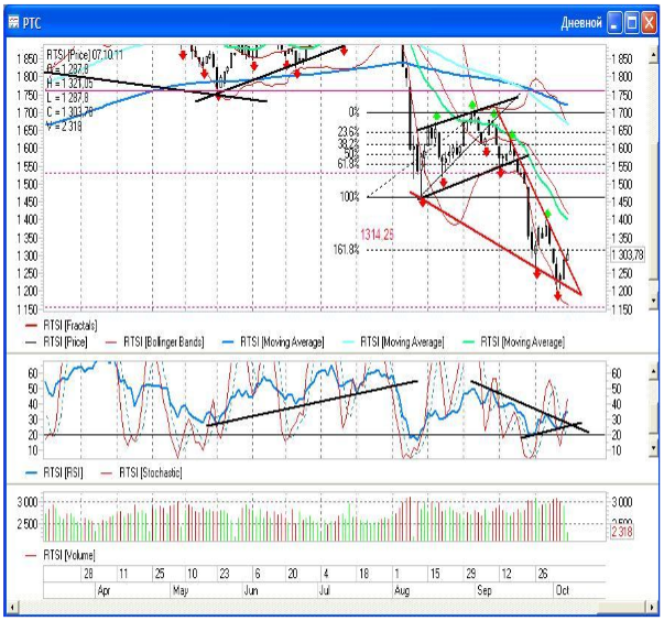 В отличие от индекса ММВБ, его коллега – индекс РТС, уже пытается выйти из сформированного нисходящего «клина» наверх. Это хорошо видно как на самом графике индекса, так и на графике его осциллятора RSI.