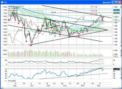 Вчера акции «Лукойла» одни из немногих удержались на достигнутых днем высотах, закрывшись с приростом в 1,2%. Как видно из графика, цены пришли именно в район 1860-1865 рублей, где находится 61,8% уровень Фибоначчи от снижения 2011 года.