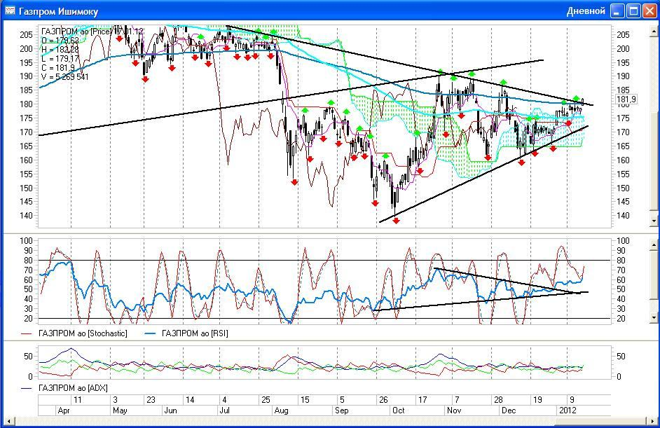 Но, учитывая, что делаю ставку на то, что образованный на индексе ММВБ (и РТС) расходящийся «треугольник» будет пробит вниз, я решила оставить «короткие» позиции в данных бумагах, по крайней мере, еще на 1-2 дня. Напомню, что от уровня 179,5-180 рублей, в четверг, мною был открыт «шорт», который я планирую удерживать с целью закрытия «гэпа», оставленного на уровне 171,9-172,22 рублей – от 3 января. К тому же акции вчера за собой оставили разрыв на уровне 178,84-179,17 рублей.