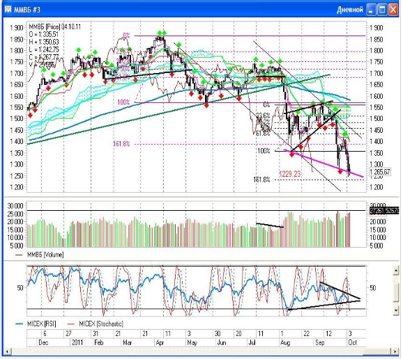 Индекс ММВБ накануне затормозил у отметки 1242,75 пунктов, вчера же при повторном снижении, индекс снова опустился к отметке 1247,84 пунктов, повторив устойчивость достигнутого накануне рубежа. На дневном графике индекса между тремя локальными минимумами можно найти тройную конвергенцию — расхождение между графиком цены и осцилляторами Stochastic и RSI. Такие сигналы обычно приводят к подъему котировок, и вероятной целью отскока, на мой взгляд, может стать район 1350-1355 пунктов по ММВБ — район августовских минимумов.