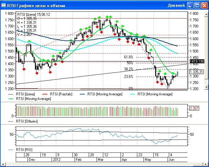 Индекс РТС должен приблизиться к 38,2% уровню коррекции к падению 1610,11-1200,67 пунктов, который находится на уровне 1357,07 пунктов, если он будет пройден, то следом индекс может подняться до 50% уровня Фибоначчи, расположенного на 1405,39 пунктах.
