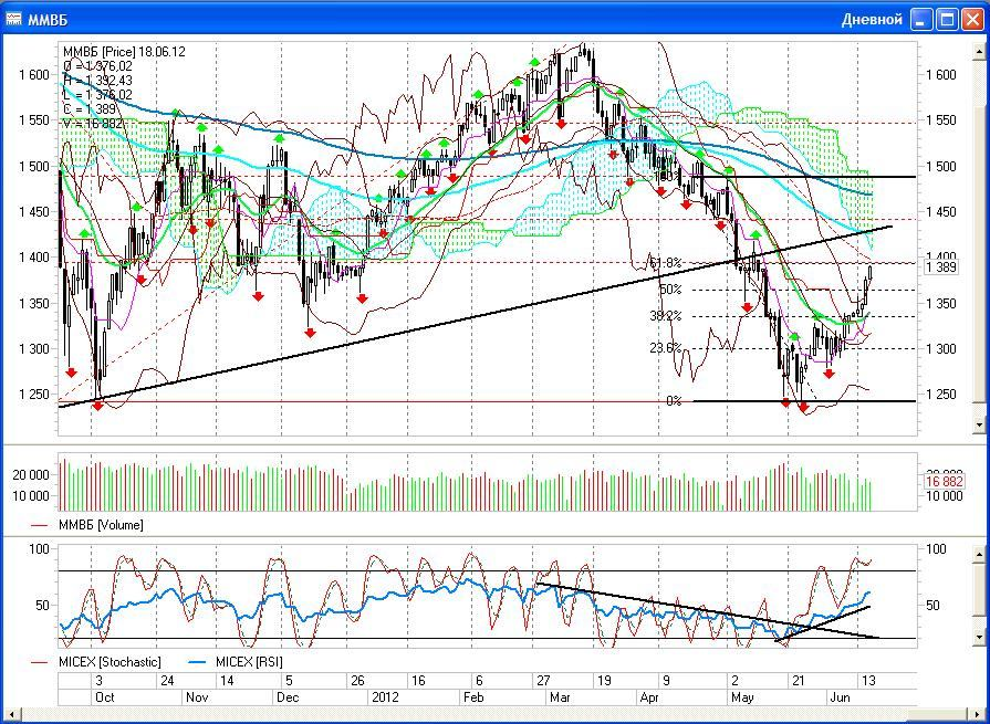 Вчера индекс ММВБ поднимался к отметке 1392,3 пунктов, как раз, немного не дойдя до района ~1395 пунктов, на который выпадают два ключевых уровня Фибоначчи: 61,8% коррекция от роста 1242,75-1639,62 пунктов и 61,8% коррекция от снижения 1489,9-1241,62 пунктов. Пока индекс логично увяз в этой зоне, выше на уровне 1418 пунктов располагаются две недельные скользящие средние ЕМА21 и ЕМА200, а через уровень 1425-1430 пунктов проходит та самая, пробитая 4 мая линия долгосрочного тренда, возврата которой я не жду, а лишь допускаю подскока к ней в рамках ретеста. Поэтому зону выше ~1400 пунктов считаю оптимальной зоной для открытия «коротких» позиций.