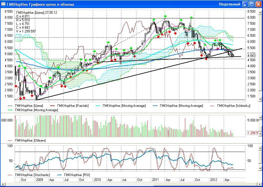 Сами индексы США DJ и S&P упали на 2,22% и 2,46% и обновили свои минимумы. Самое главное, что хочется отметить, этот тот факт, что оба индекса и фьючерс на miniS&P500 закрыли и день, и неделю ниже своих 61,8% уровней коррекции от роста с декабря 2011 года. У индекса DJ данный рубеж располагался на отметке 12347,79 пунктов, у индекса S&P на уровне 1286,41 пунктов, а у его фьючерса на уровне 1280,66 пунктов. Всё это означает только одно – американские индексы также перешли в фазу самостоятельного движения вниз, и наличие образованных ранее «медвежьих» свечных моделей на недельном и месячном графике, лишь подтверждает это.